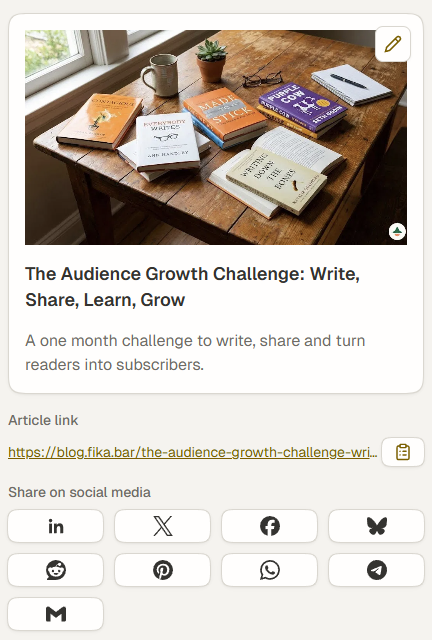 Compartir tu trabajo no debería sentirse como hacer marketing. Un clic es suficiente para enviar una publicación a plataformas sociales, chats o cualquier lugar donde tu audiencia ya esté. Para muchos escritores en el reto, la distribución es la parte más difícil. Esta función está diseñada para eliminar un poco de esa fricción.